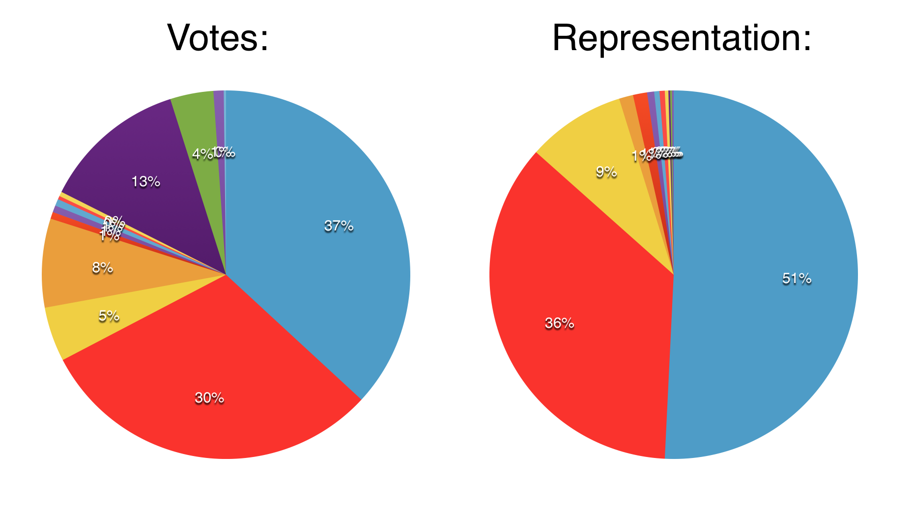 I must say, I was pleasantly surprised that our representation is as good as it is. You can see the fact that smaller parties are punished somewhat while larger ones are rewarded (which is the system working as intended) but overall, the representation is really good. Since parties need to be above the 4% mark to even be considered for the seats, I really should have removed the ones below that line in the left chart but I don’t really feel like it.
